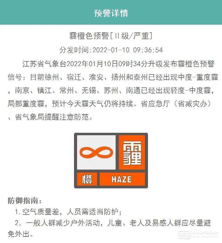 正文摘要:江蘇省氣象臺2022年01月10日09時34分升級發(fā)布霾橙色預(yù)警信號:目前徐州、宿遷、淮安、揚(yáng)州和泰州已經(jīng)出現(xiàn)中度-重度霾,南京、鎮(zhèn)江、常州、無錫、蘇州、南通已經(jīng)出現(xiàn)輕度-中度霾,局部重度霾,預(yù)計(jì)今天霾天氣仍將持續(xù) ... |
