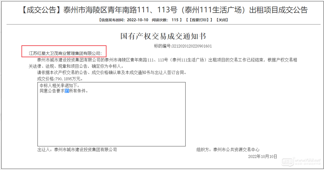 正文摘要:前幾天,一篇關(guān)于111生活廣場(chǎng)整體招租的消息,備受關(guān)注。 近日,泰州公共交易平臺(tái)發(fā)布最新成交通知書(shū)。江蘇紅星大衛(wèi)茂商業(yè)管理集團(tuán)有限公司正式中標(biāo),將承租該商業(yè)體,租金790.1895萬(wàn)元。 這次進(jìn)展快了 ... |
