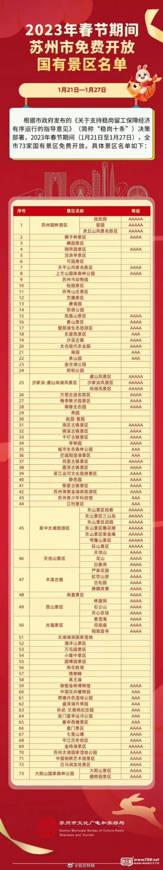 正文摘要:2023年春節(jié)期間(1月21日-1月27日),江蘇多家國(guó)有景點(diǎn)免費(fèi)對(duì)外開放。其中包括:揚(yáng)州的瘦西湖、大明寺、個(gè)園、何園等8家國(guó)有景點(diǎn);蘇州的拙政園、留園、獅子林、滄浪亭等73家國(guó)有景區(qū)。 |