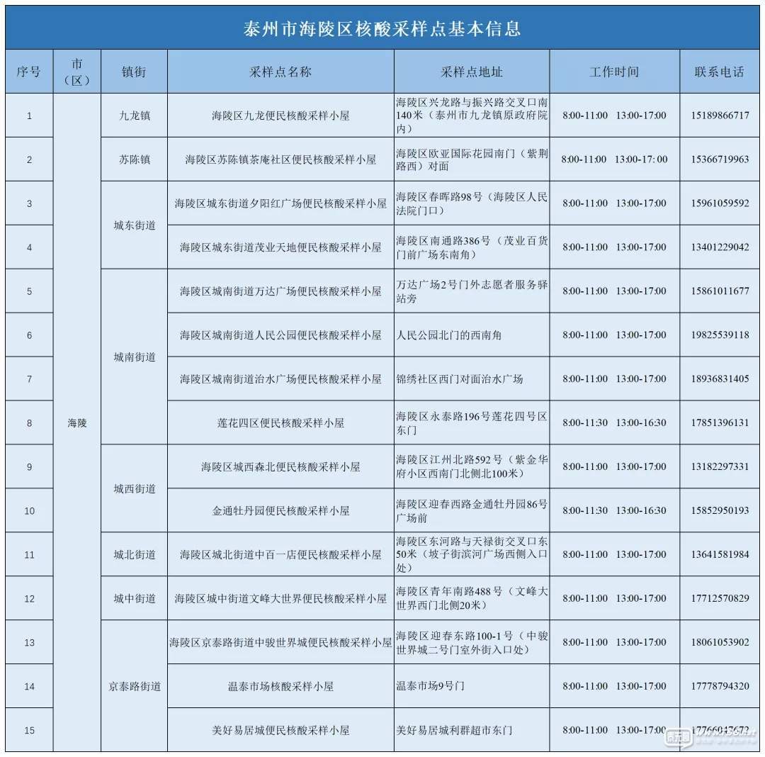 正文摘要:為滿足群眾核酸檢測(cè)需求 現(xiàn)將海陵區(qū)核酸采樣點(diǎn) 予以公布 有需要的市民 可就近選擇檢測(cè)點(diǎn) ▲點(diǎn)擊圖片查看大圖 |
