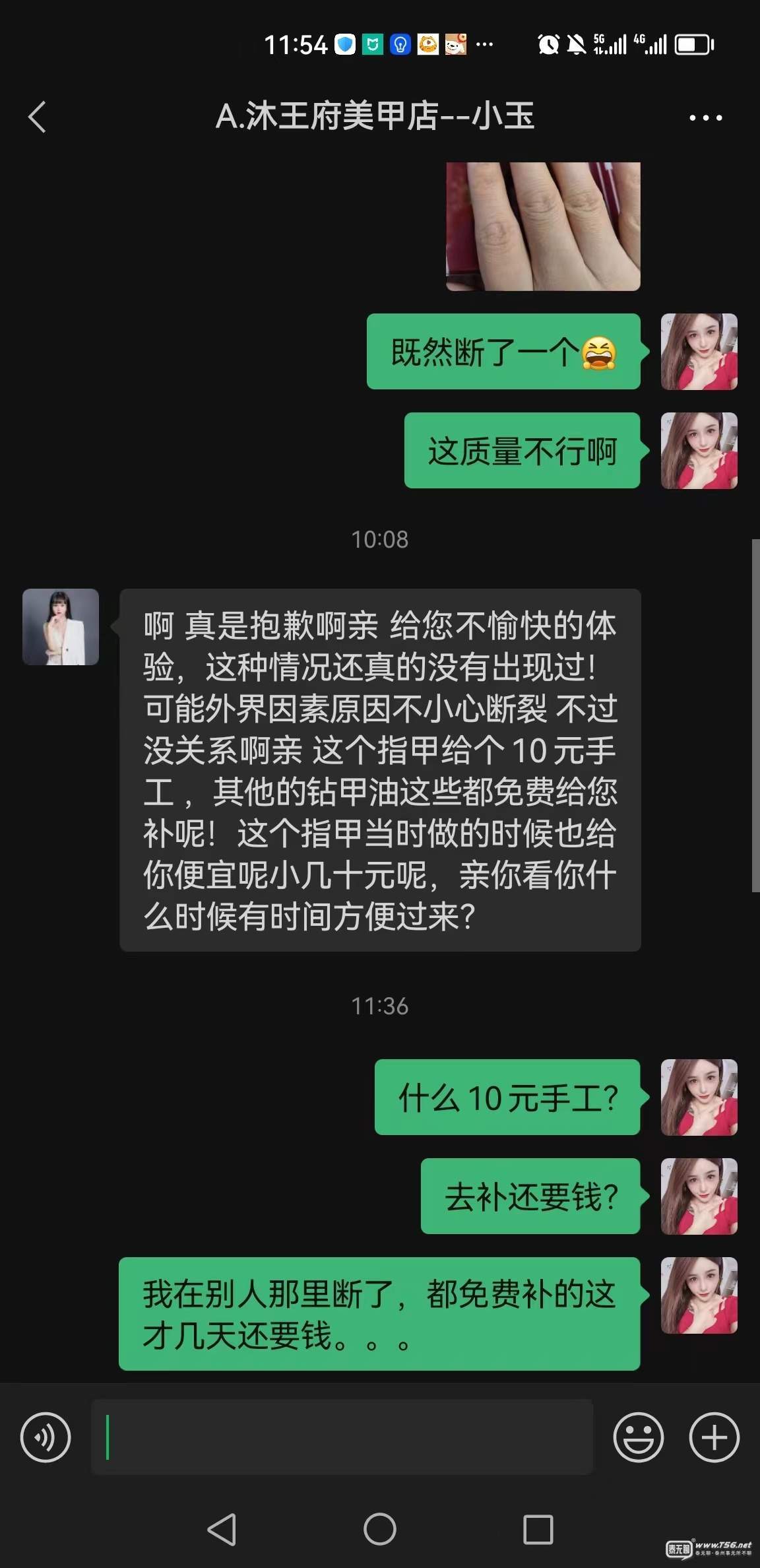 那天晚上好像快11點的時候做好了,第48小時的時候,才發(fā)現(xiàn)斷了,跟她溝通,她竟然還說收錢,就48個小時在你家做的指甲斷了,我又不做飯不做家務(wù)的,還說是我人為因素,吐血