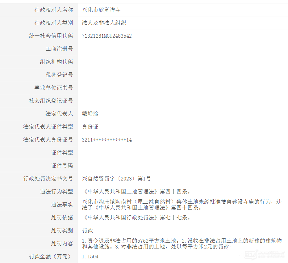 興化市欣覺禪寺,集體土地未經(jīng)批準(zhǔn)擅自建設(shè)寺廟,罰款1.1504萬元。