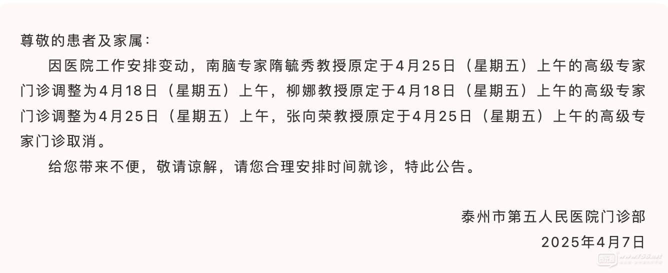 【公告】本月泰州五院;南京腦科專家門診調(diào)整