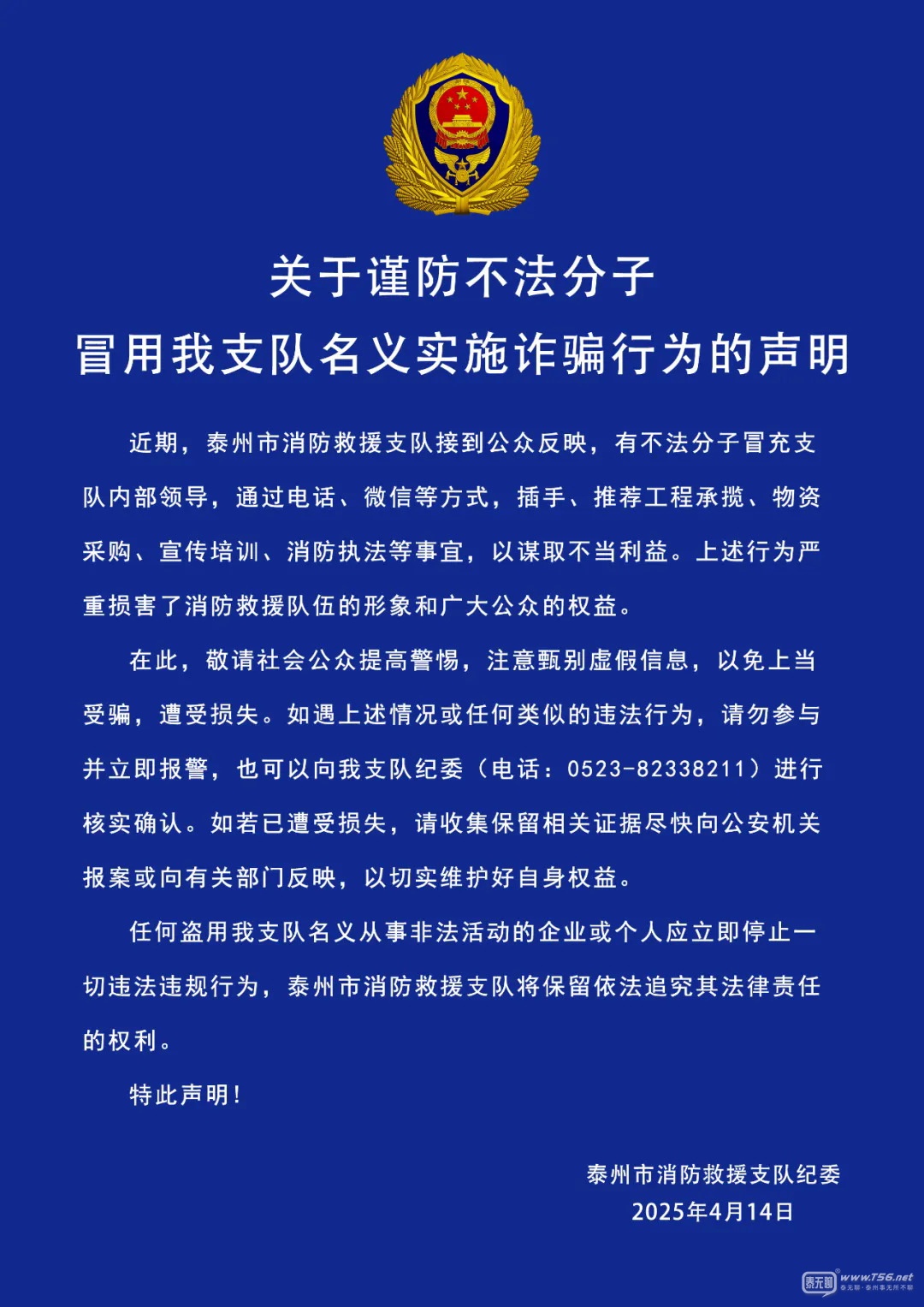 關(guān)于謹(jǐn)防不法分子冒用泰州市消防支隊(duì)名義實(shí)施詐騙行為的聲明