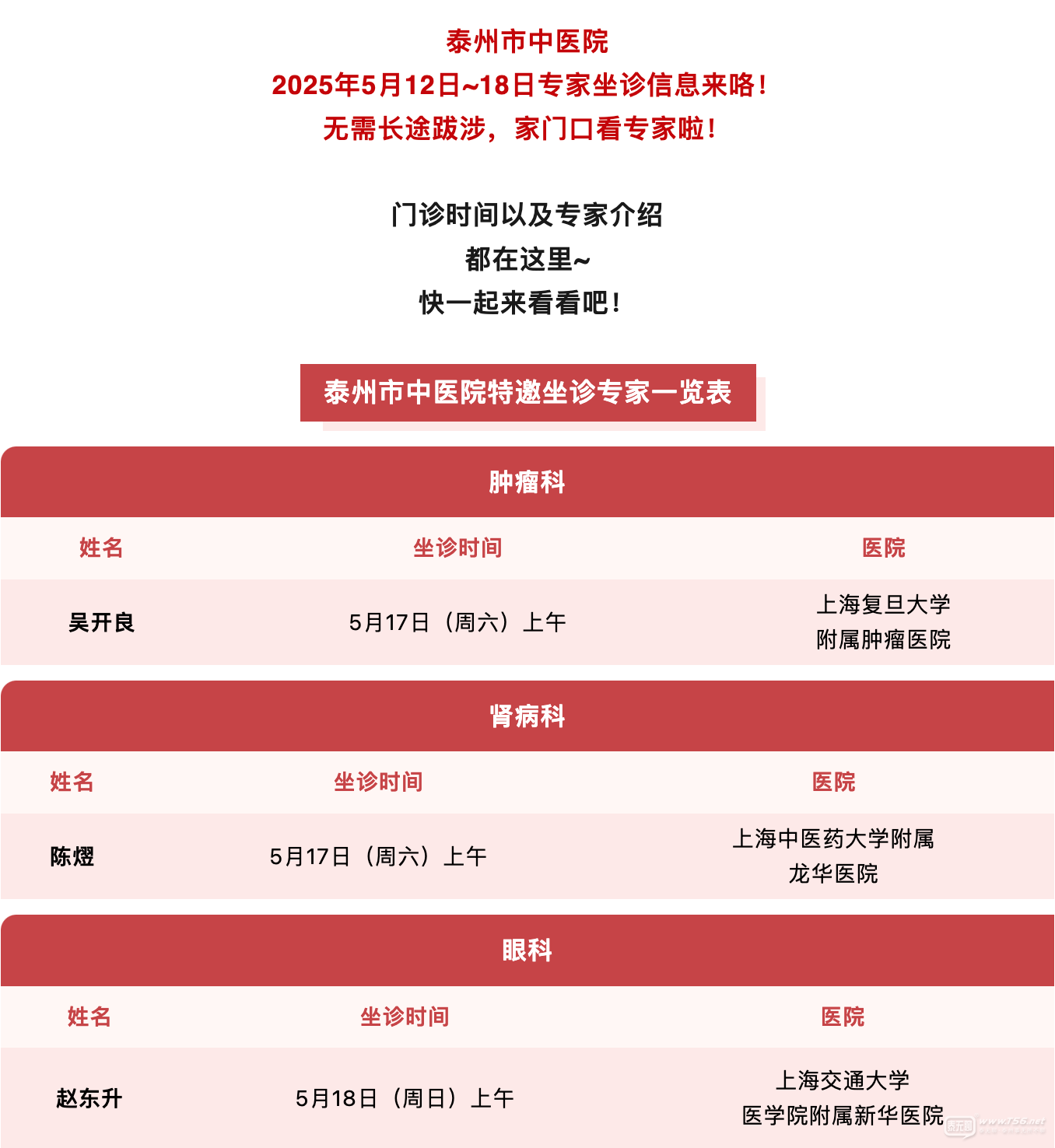 【健康直通車】健康無需遠行!泰州市中醫(yī)院(5月12~18日)特邀專家來院坐診一覽