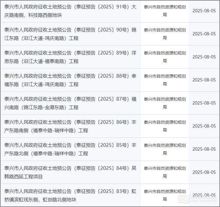 8月5日,泰興市人民政府連發(fā)九則征收土地預公告,一起來看看。
