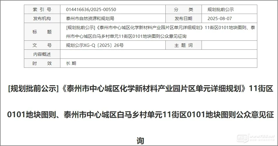 近日,泰州市自然資源和規(guī)劃局發(fā)布[規(guī)劃批前公示]《泰州市中心城區(qū)化學(xué)新材料產(chǎn)業(yè)園片區(qū)單元詳細(xì)規(guī)劃》11街區(qū)0101地塊圖則、泰州市中心城區(qū)白馬鄉(xiāng)村單元11街區(qū)0101地塊圖則公眾意見征詢。