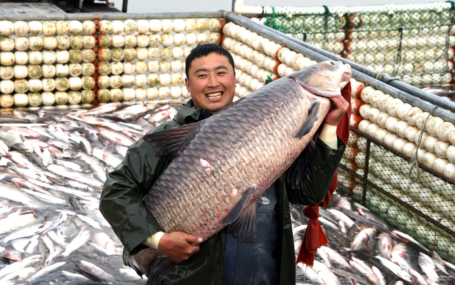 元月十一日,溱湖冬捕節(jié)拉開帷幕,圖為冬捕節(jié)上的漁民,興高采烈地抱著本屆冬捕節(jié)的魚王向賓客展示。