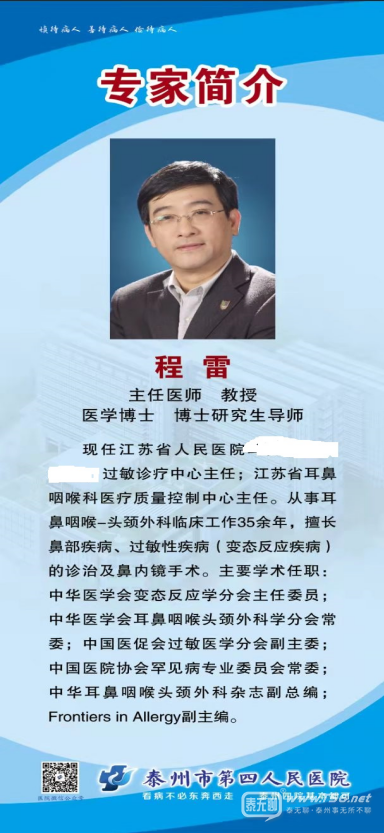 江蘇省人民醫(yī)院過敏診療中心主任,江蘇省耳鼻咽喉科醫(yī)療質(zhì)量控制中心主任,主任醫(yī)師、博士研究生導(dǎo)師程雷教授,將于2025年12月26日(周五)上午,來泰州四院耳鼻咽喉科進(jìn)行診療活動。重點開展:成人及兒童過敏性鼻 ...
