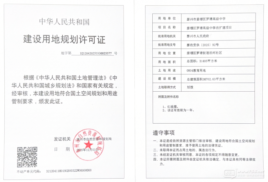 正文摘要:羅塘高中改擴(kuò)建項(xiàng)目 規(guī)劃許可證獲批,羅塘高中改擴(kuò)建項(xiàng)目即將進(jìn)入施工階段! 近日,泰州市自規(guī)局發(fā)布關(guān)于羅塘中學(xué)改擴(kuò)建工程建設(shè)用地規(guī)劃許可證地字第3212042025YG0025577號(hào)。 作為姜堰四星級(jí)高中之一 ... |