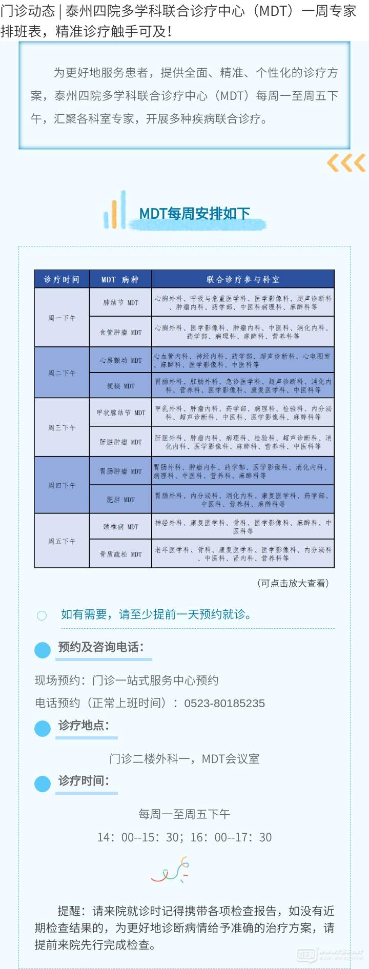 門診動態(tài) | 泰州四院多學科聯(lián)合診療中心(MDT)一周專家排班表,精準診療觸手可及!