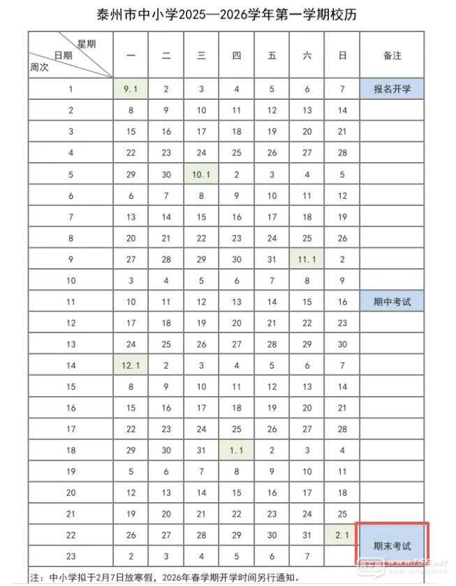 2026年江蘇中小學、幼兒園寒假統(tǒng)一定為2月7日至3月4日,共26天。 另外,根據泰州市中小學生2025至2026學年第一學期校歷,這兩周泰州各校將陸續(xù)開始期末考試。