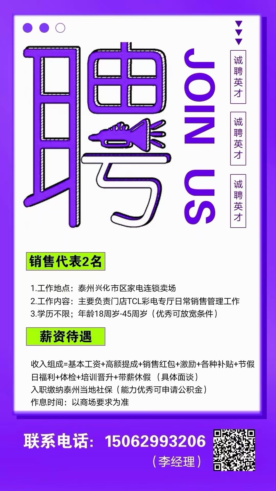 TCL招聘:我們需要熱愛銷售、熱愛學(xué)習(xí)、志同道合的小伙伴們同我們一起共創(chuàng)未來!工作地點(diǎn):泰州興化市區(qū)連鎖賣場(chǎng) 需要招聘2名品牌銷售代表、泰州靖江市區(qū)連鎖賣場(chǎng) 需要招聘2名品牌銷售代表;收入組成:基本工資+高額提成、銷售紅包+各種補(bǔ)貼+各種獎(jiǎng)項(xiàng)+節(jié)假日福利+每年體檢+培訓(xùn)進(jìn)升+帶薪休假+泰州當(dāng)?shù)厣绫;收入無上限,年薪十萬(wàn)不是夢(mèng)!作息時(shí)間:以商場(chǎng)要求為準(zhǔn);要求:開朗、熱情、執(zhí)行力,有銷售經(jīng)驗(yàn)者優(yōu)先!能力有多大舞臺(tái)就有多大!